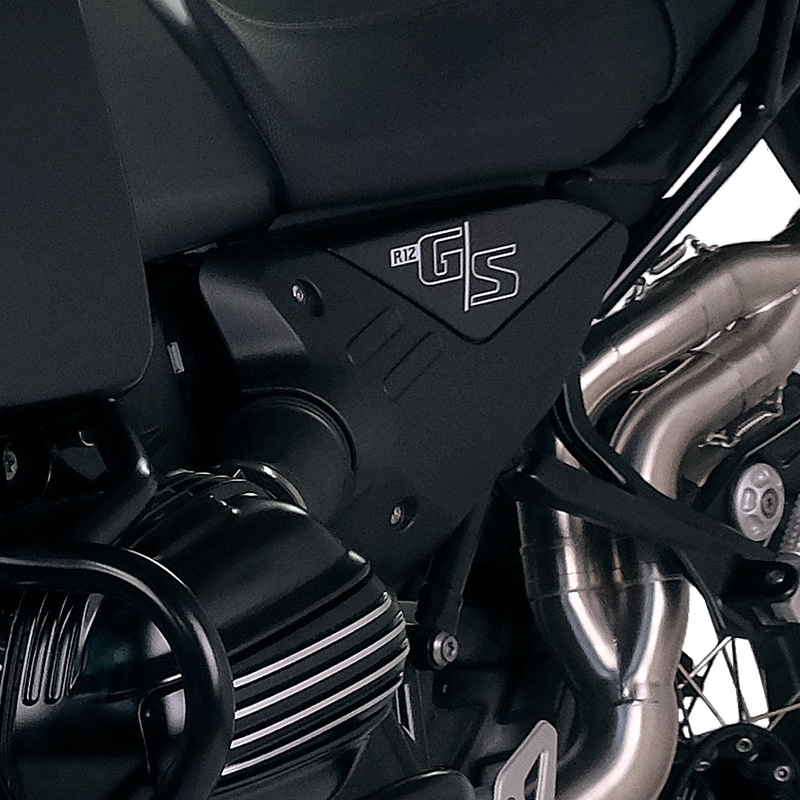 Coppia adesivi di protezione neri con logo G/S protetti con speciale pellicola resistente UV pronti per essere applicati sui fianchetti originali del BMW R12 G/S