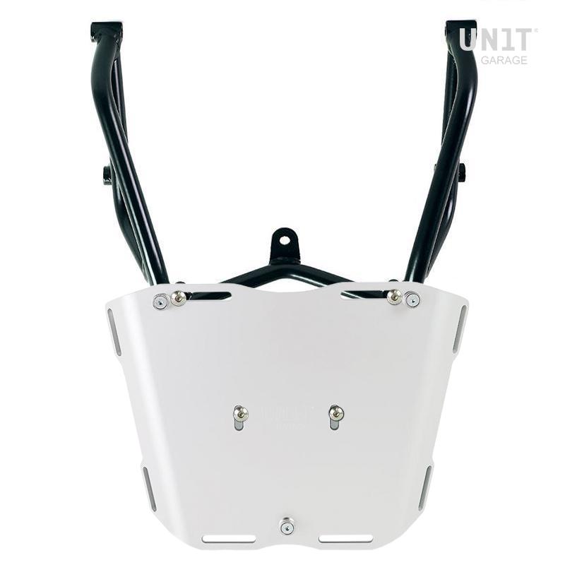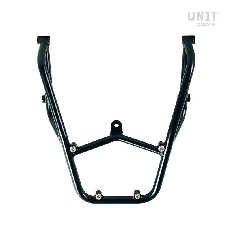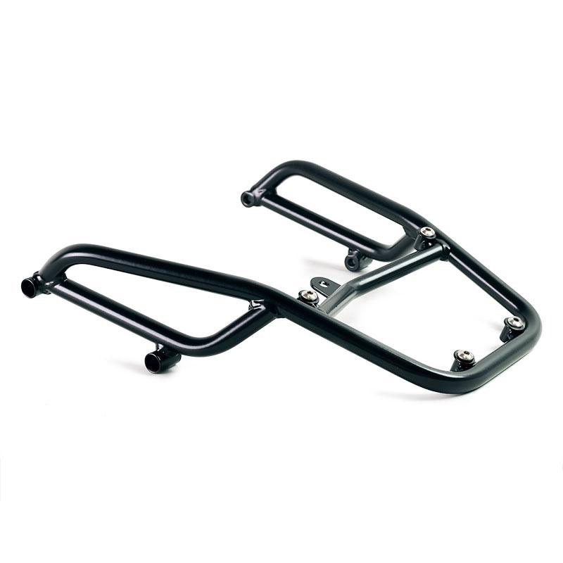 Portapacchi realizzato in tubo di acciao con finitura nero opaco a polveri epossidiche. Completa la parte posteriore ed è provvisto di maniglie per il passeggero, si fissa molto semplicemente sulla moto originale con le viti in dotazione. Robusto e pratico, è provvisto sul piano di appoggio di 4 boccole per fissaggio della piastra codice: AL5.