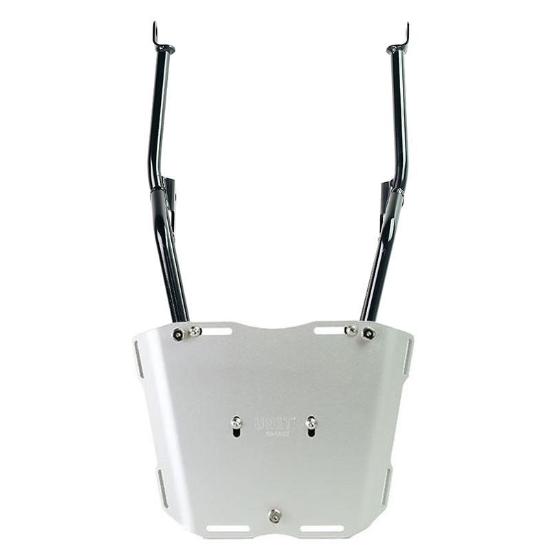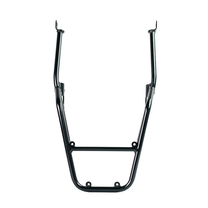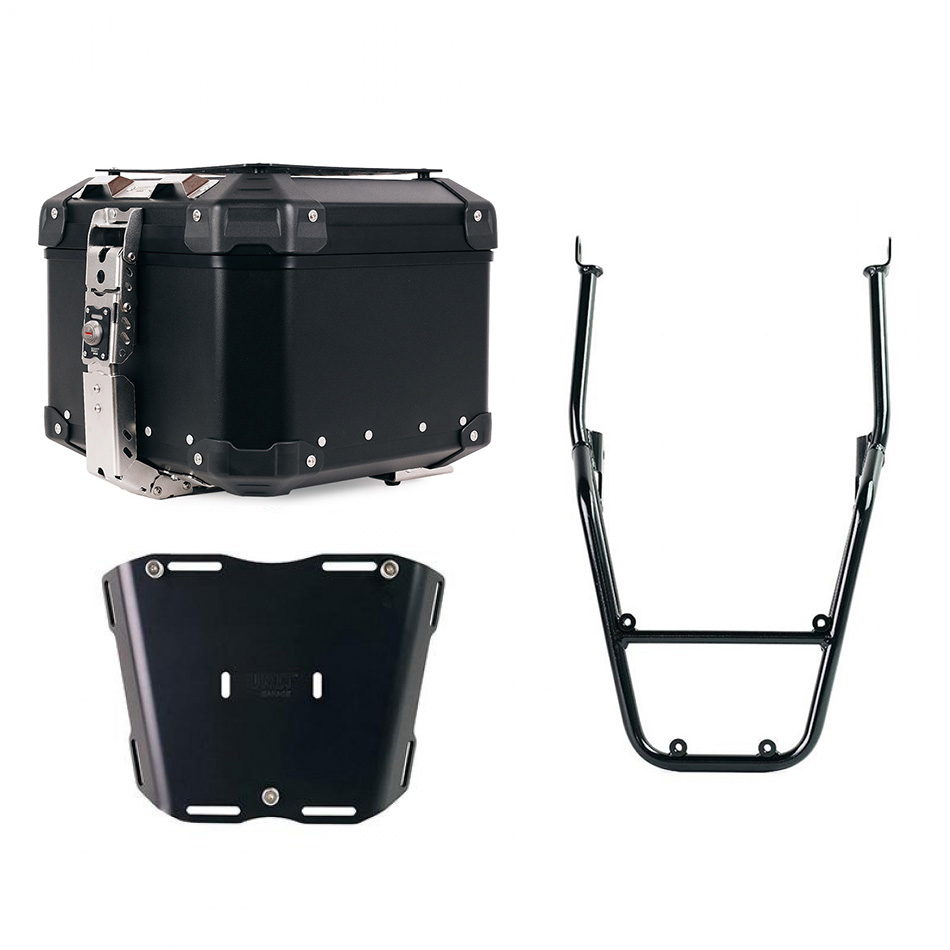 Portapacchi realizzato in tubo di acciao con finitura nero opaco a polveri epossidiche. Completa la parte posteriore ed è provvisto di maniglie per il passeggero, si fissa molto semplicemente sulla moto originale. Robusto e pratico, è provvisto sul piano di appoggio di 4 boccole per fissaggio della piastra AL5.