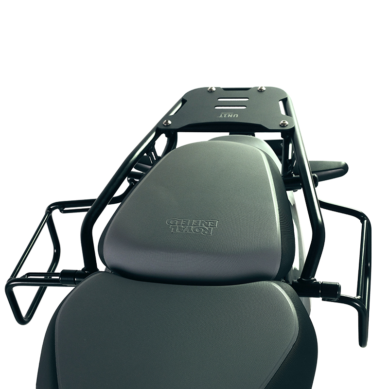 Disegnato sul telaio Royal Enfield si integra perfettamente con il resto della moto ed è realizzato in acciaio trattato con finitura nero opaco a polveri epossidiche