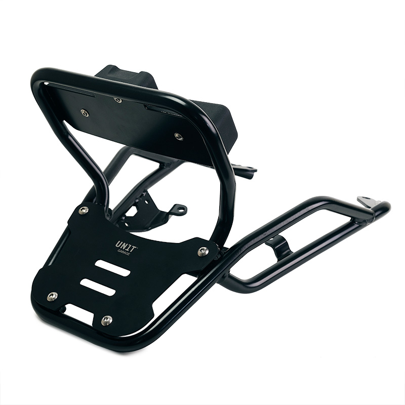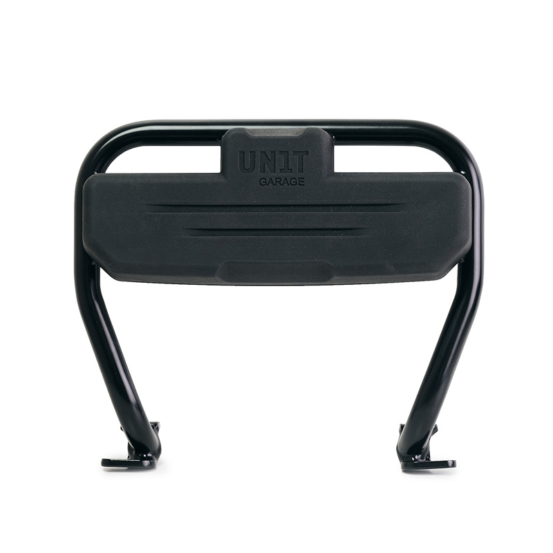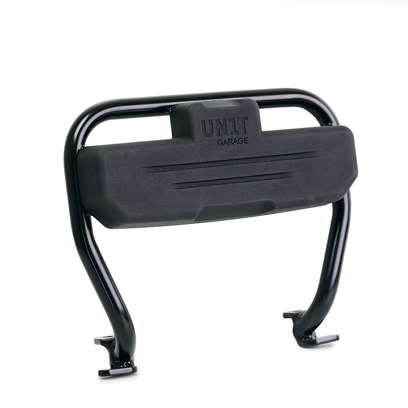 Schienalino per bauletti Atlas in poliuretano nero completo di tubo di fissaggio, predisposto per il montaggio sui nostri portapacchi.