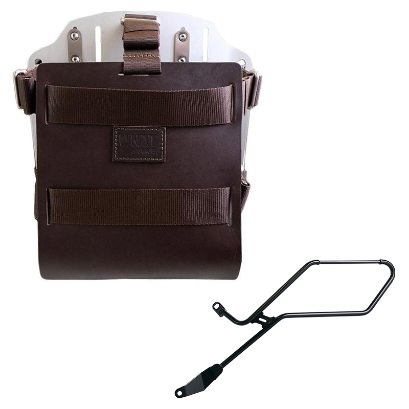 Piastra portaborse in alluminio anodizzato completa di frontale in cuoio regolabile. Si aggancia velocemente ai nostri telai porta borsa con il sistema a sgancio rapido cod.U000 già incluso e montato sul retro della piastra, che è provvisto di serratura per il bloccaggio sul telaio stesso. La piastra crea una superficie di montaggio piatta sul lato della moto, questo consentirà il trasporto di borse senza aggancio o altri oggetti, tipo sacco a pelo, giacche etc. La patta frontale, curata nei minimi dettagli con finiture in cuoio da 3 mm, può essere regolata tramite i cursori in dotazione e può essere rimossa molto velocemente dalla piastra.
