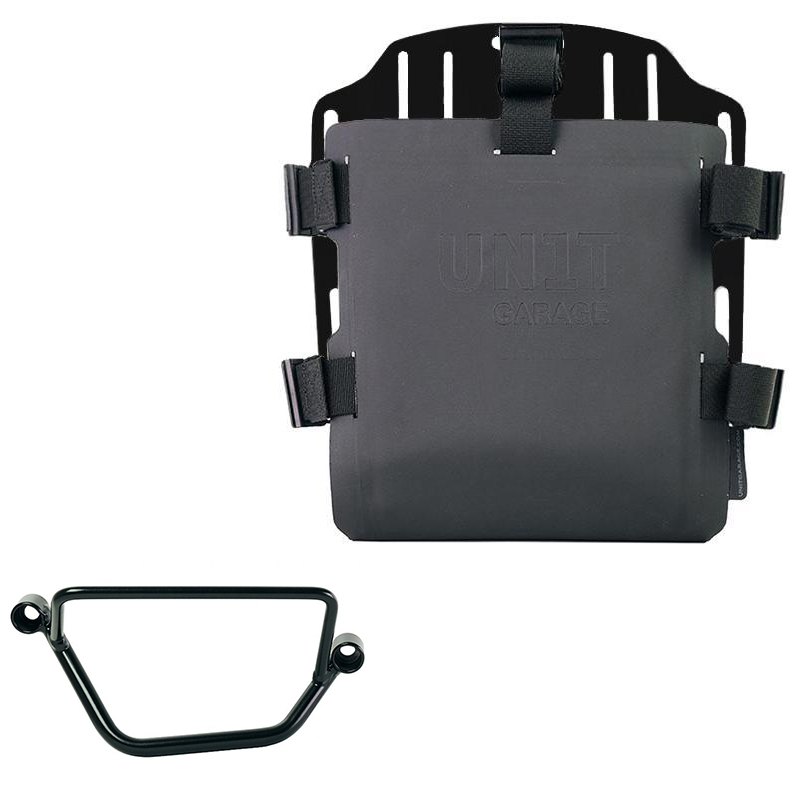 piastra, che è provvisto di serratura per il bloccaggio sul telaio stesso. La piastra crea una superficie di montaggio piatta sul lato della moto, questo consentirà il trasporto di borse senza aggancio o altri oggetti, tipo sacco a pelo, giacche etc. La patta frontale, curata nei minimi dettagli, con finiture in Hypalon, può essere regolata tramite i cursori in dotazione e può essere rimossa molto velocemente dalla piastra.