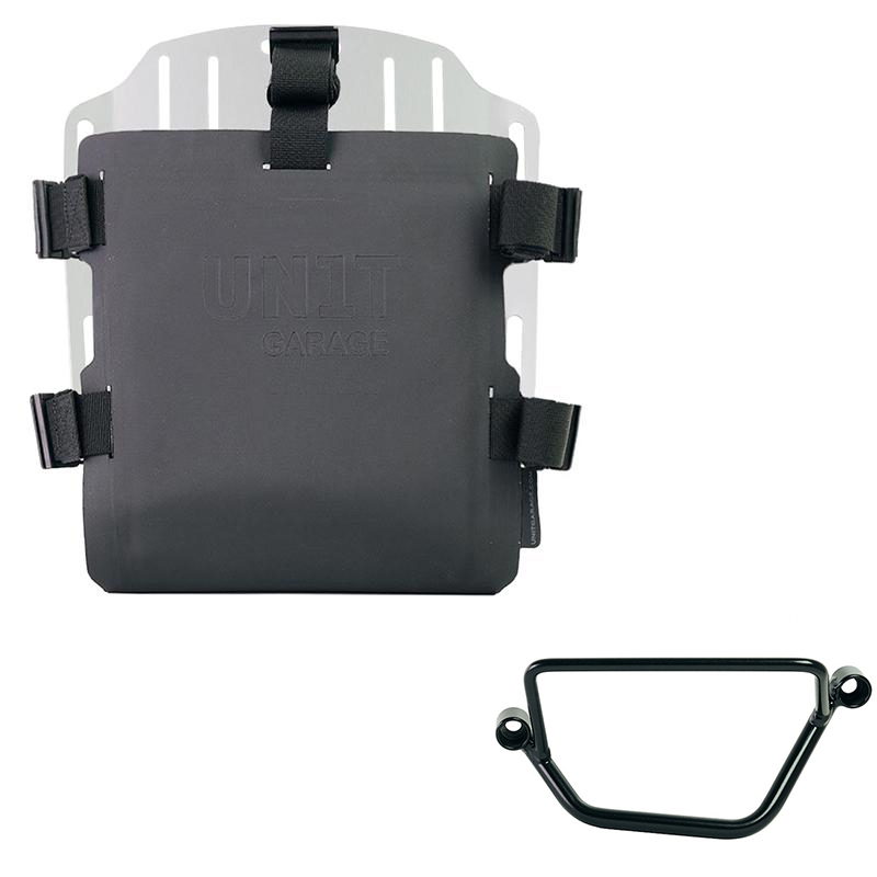 piastra, che è provvisto di serratura per il bloccaggio sul telaio stesso. La piastra crea una superficie di montaggio piatta sul lato della moto, questo consentirà il trasporto di borse senza aggancio o altri oggetti, tipo sacco a pelo, giacche etc. La patta frontale, curata nei minimi dettagli, con finiture in Hypalon, può essere regolata tramite i cursori in dotazione e può essere rimossa molto velocemente dalla piastra.