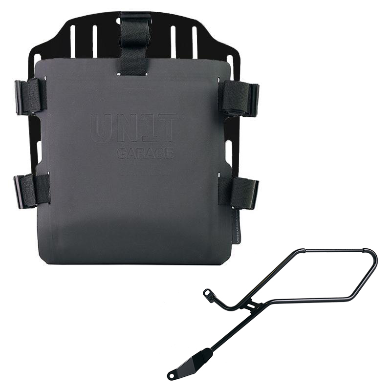 piastra, che è provvisto di serratura per il bloccaggio sul telaio stesso. La piastra crea una superficie di montaggio piatta sul lato della moto, questo consentirà il trasporto di borse senza aggancio o altri oggetti, tipo sacco a pelo, giacche etc. La patta frontale, curata nei minimi dettagli, con finiture in Hypalon, può essere regolata tramite i cursori in dotazione e può essere rimossa molto velocemente dalla piastra.