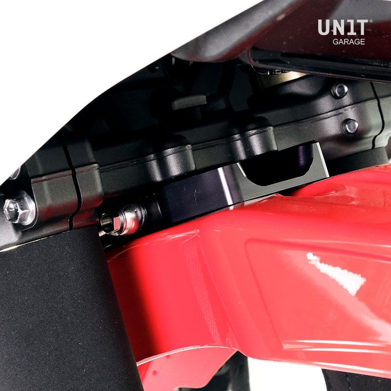 Questo kit completo vi consentirà di montare il parafango in posizione alta sotto alle piastre forcella.