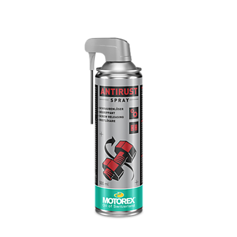 Motorex Antirust Spray, rimuove la ruggine e sblocca le viti grazie alla sua notevole forza di penetrazione. Agisce sulle parti metalliche arrugginite. Protegge dalla corrosione e non lascia passare l’umidità. Elimina la ruggine, respinge l’acqua e lubrifica.