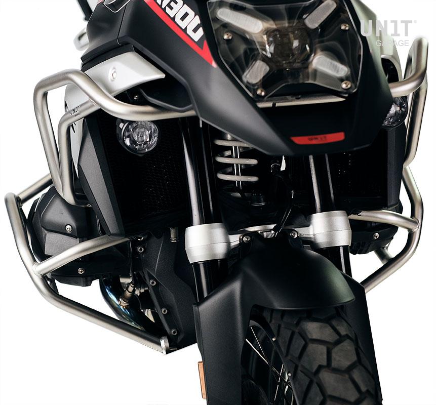 Belle avvolgenti e compatte, sono molto più efficaci rispetto ai paracilindri tradizionali presenti sul mercato, in quanto sono infulcrate in tre punti sul telaio della moto per proteggere le preziose testate del vostro boxer. Si integrano perfettamente con il telaio della R1300GS e sono molto protettive in caso di caduta. Realizzate in acciaio inox trattato con vernici a polveri ad alta resistenza. Di facile montaggio, vengono fornite complete di boccole in acciaio con coperture in plastica da inserire nel telaio. La maggior parte dei lavori di manutenzione può essere eseguita senza lo smontaggio della barra.