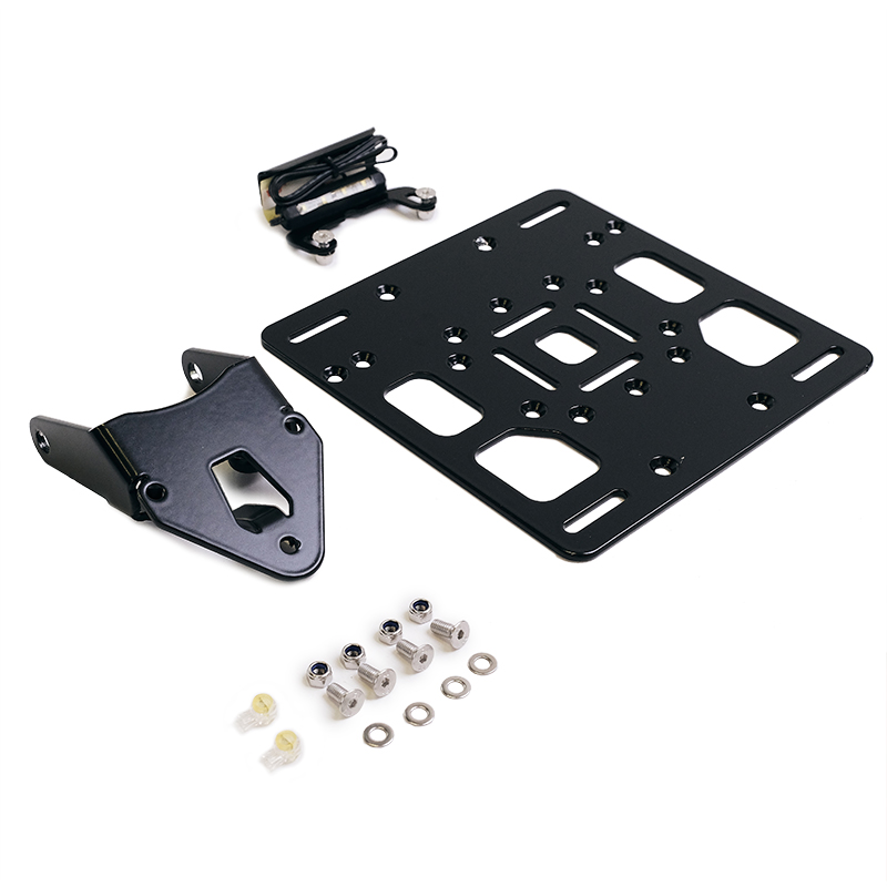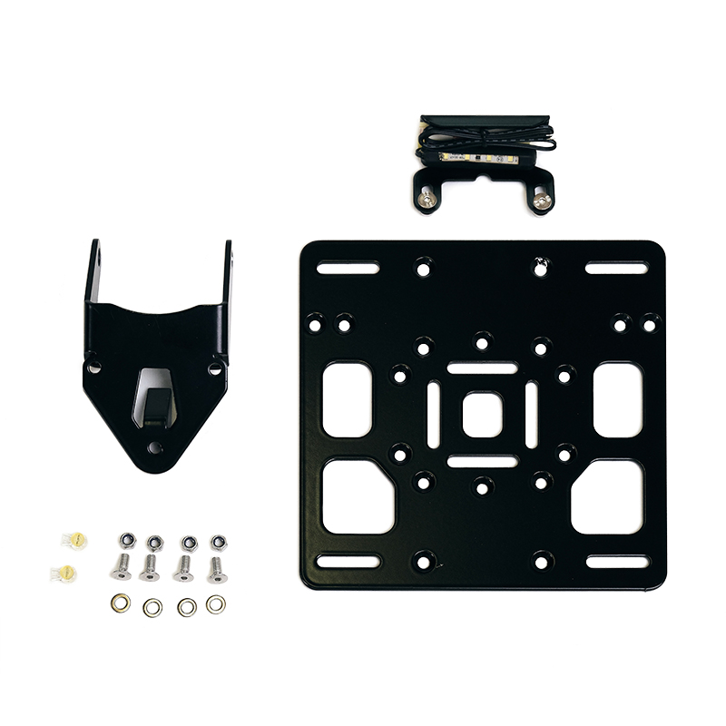 La plastica posteriore ci disturbava: il risultato è fantastico! Realizzato in acciaio verniciato nero a polveri epossidiche viene fornito completo di luce targa e relativa staffa. Si fissa al faro molto semplicemente e consente di modificare notevolmente il carattere e lo stile della moto nella parte posteriore accorciando e alzando la targa. Completo di tutto il necessario per il montaggio, è compatibile sia con i nostri telai portaborse e portapacchi che con quelli originali.