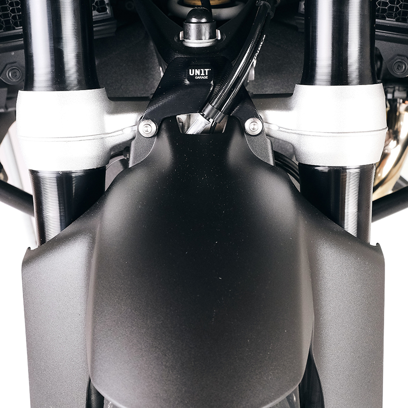 Protezione telelever ricavata dal pieno al cnc con finitura anodizzata nera.