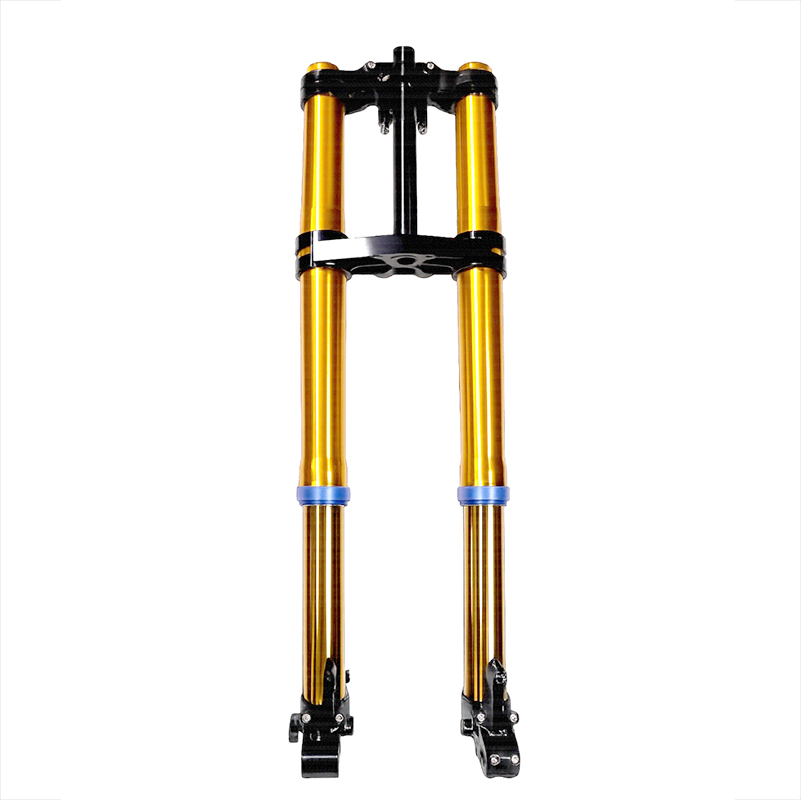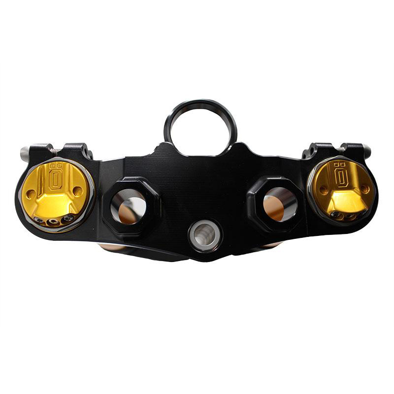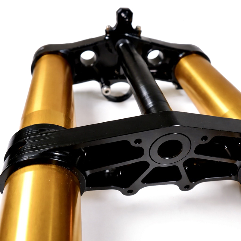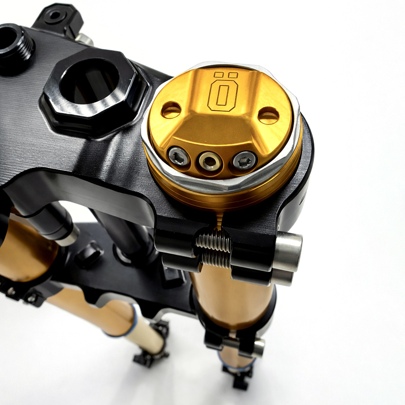 Piastre e piedini disegnati ad-hoc e ricavati dal pieno al CNC. Le regolazioni di compressione ed estensione vengono eseguite facilmente. La nuova forcella anteriore offre un notevole miglioramento della guida sia su strada che off-road. Il design di piastre e piedini e' stato riprogettato per rendere tutto l'avantreno molto "cattivo", e rendere tutto plug and play. Potete riutilizzare: le pinze originali e relativa viteria, il supporto del faro e i riser manubrio originali, il canotto di sterzo, dadi di serraggio e cuscinetti.