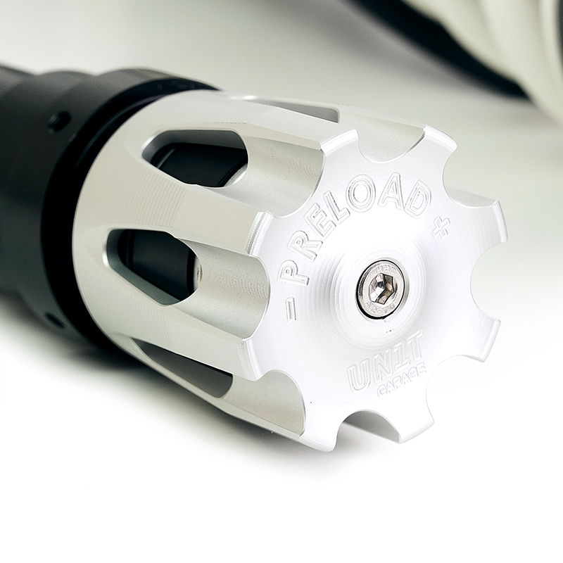 Pomello ricavato dal pieno in pregiata lega di alluminio, sostituisce il pomello originale in plastica sul precarico dell'ammortizzatore originale.